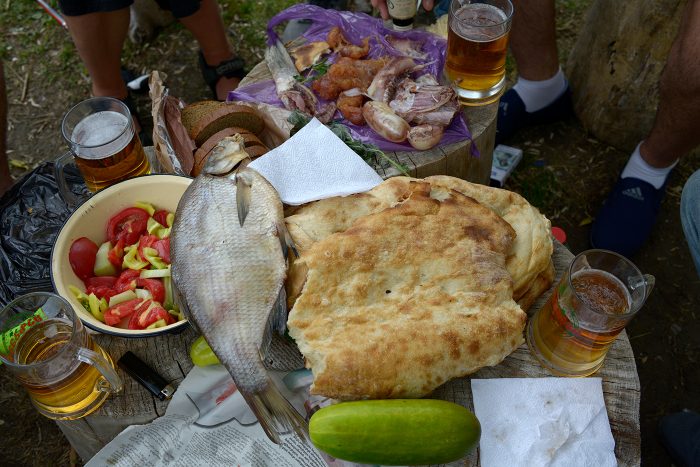 Als Antidot gibt man uns rohen, gesalzenen Fisch, Salat, Brot und Bier. Silke trinkt darüber hinaus noch zwei Schluck vom dargebotenen Chacha, was wenige Meter später katastrophale Folgen hat. Davon gibt es keine Fotos.