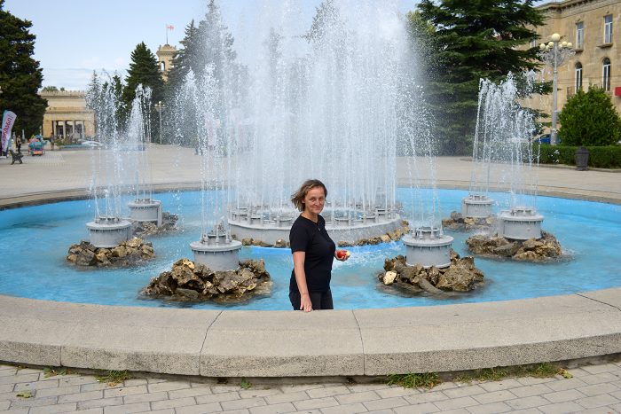 Erst drei Ohnmachtsanfälle und einige Aufregung später komme ich in Gori (auf dem dort dann abgebrochenen Weg ins Krankenhaus) wieder dazu, die Fußkühlung in Stalins Springbrunnen zu dokumentieren. Welches Tier die sehr schmerzhafte Katastrophe verursacht hat bleibt im Dunkeln, aber ich vermute einen Spinnenbiss. Eine kleine Schwarze Witwe würde von den Symptomen her passen.
